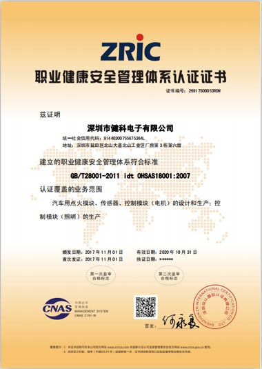 健科電子ISO14001/OHSAS18001體系順利通過認證,于2017年11月1日正式頒發(fā)了證書。