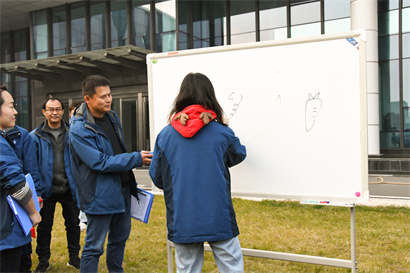 “珠行萬(wàn)里”“急速60秒”“畫畫猜歌名”“拔河比賽”。每個(gè)項(xiàng)目都成功吸引到忠實(shí)擁護(hù)的鐵粉,盡管有沒(méi)厘清楚規(guī)則就手忙腳亂的開(kāi)始拿著u型道具亂奔的朋友,還有益智猜卡片規(guī)則卡殼到懷疑自己智商的朋友,也有瞪著圓溜溜的大眼要在白板上畫野狼disco卻不知道怎么下筆的朋友。諸多坎坷也不影響到員工們的興致盎然,逗得觀賽的同事們又急又好笑。